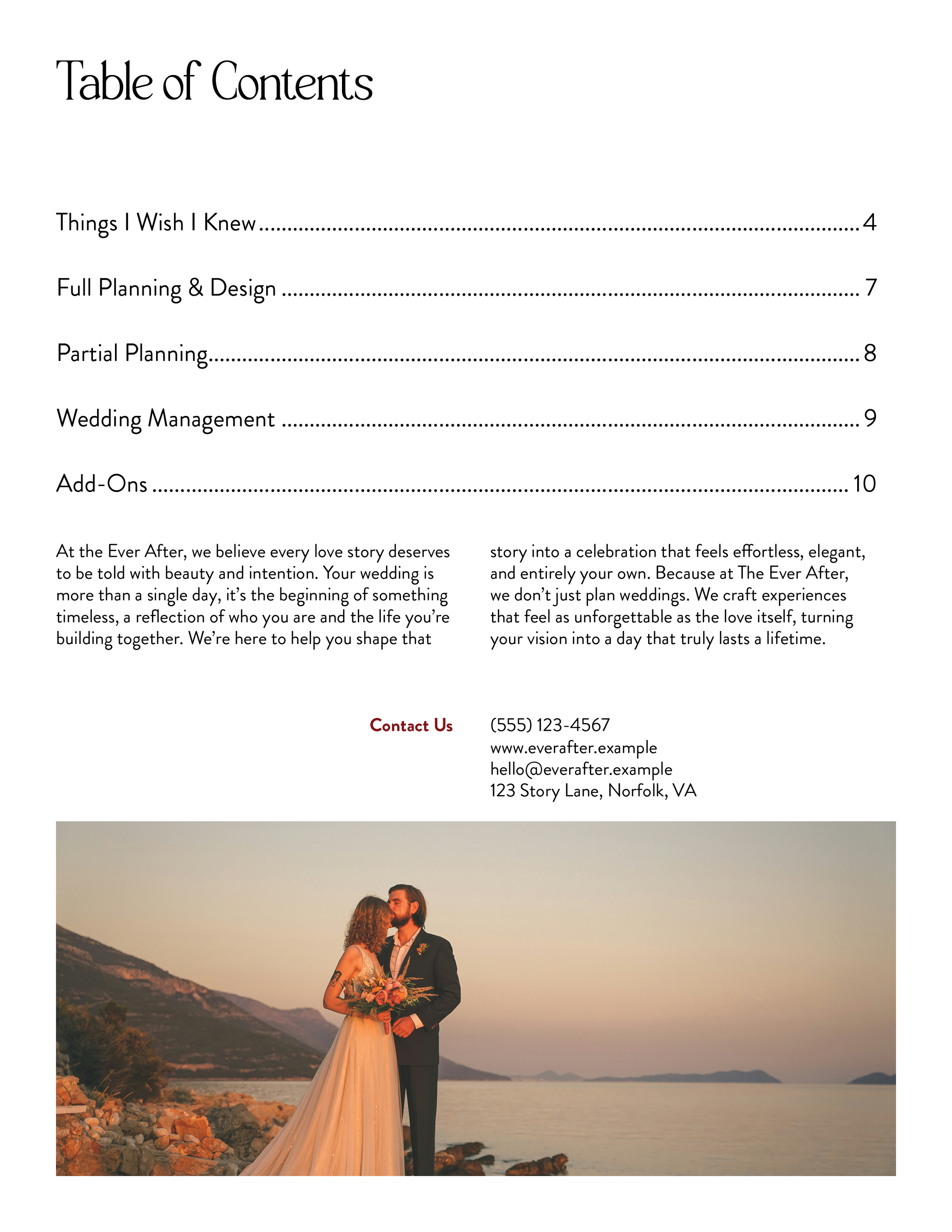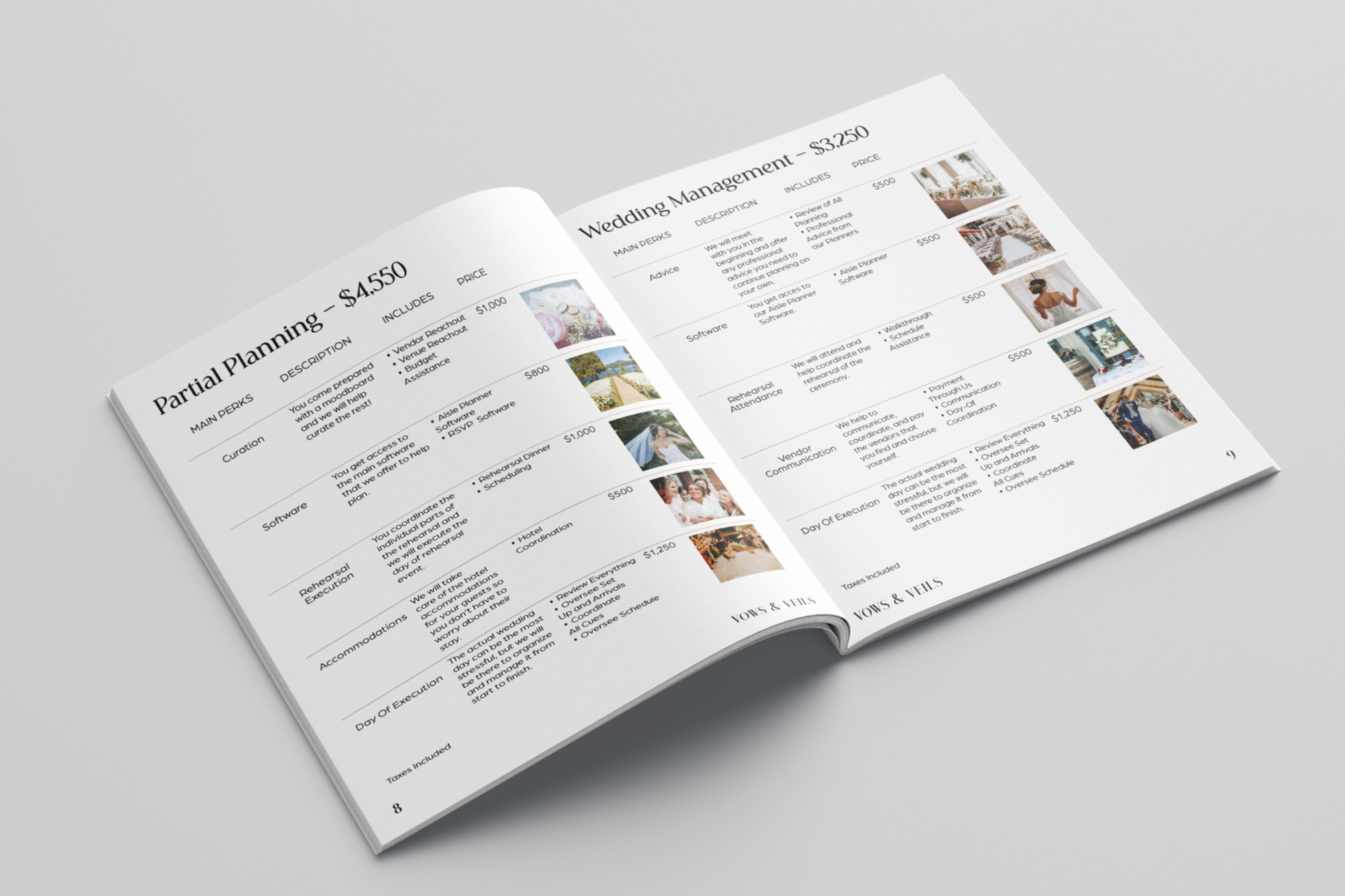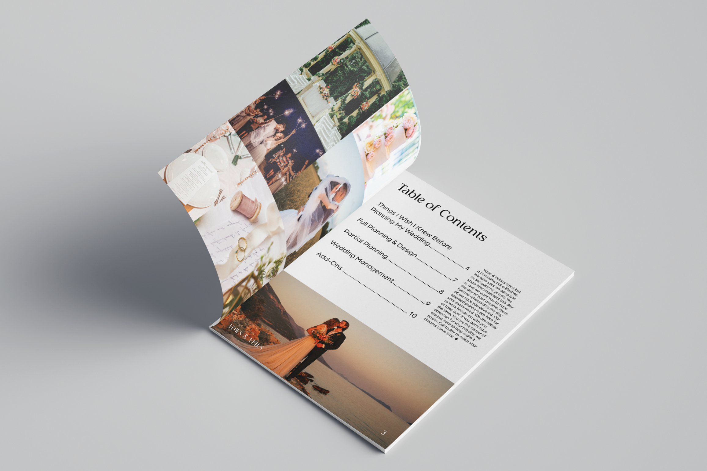The Ever After originally began as Vows & Veils, a project I created to challenge myself while learning InDesign. I wanted to design a service catalog that made use of the table tool, combining my love for weddings and layout design with a new technical skill. The result was a 12-page catalog featuring an article and four coordinated tables. From wireframe to final, the concept stayed true to my vision, though I streamlined the design by unifying the tables into one consistent style for a cleaner, more cohesive layout.