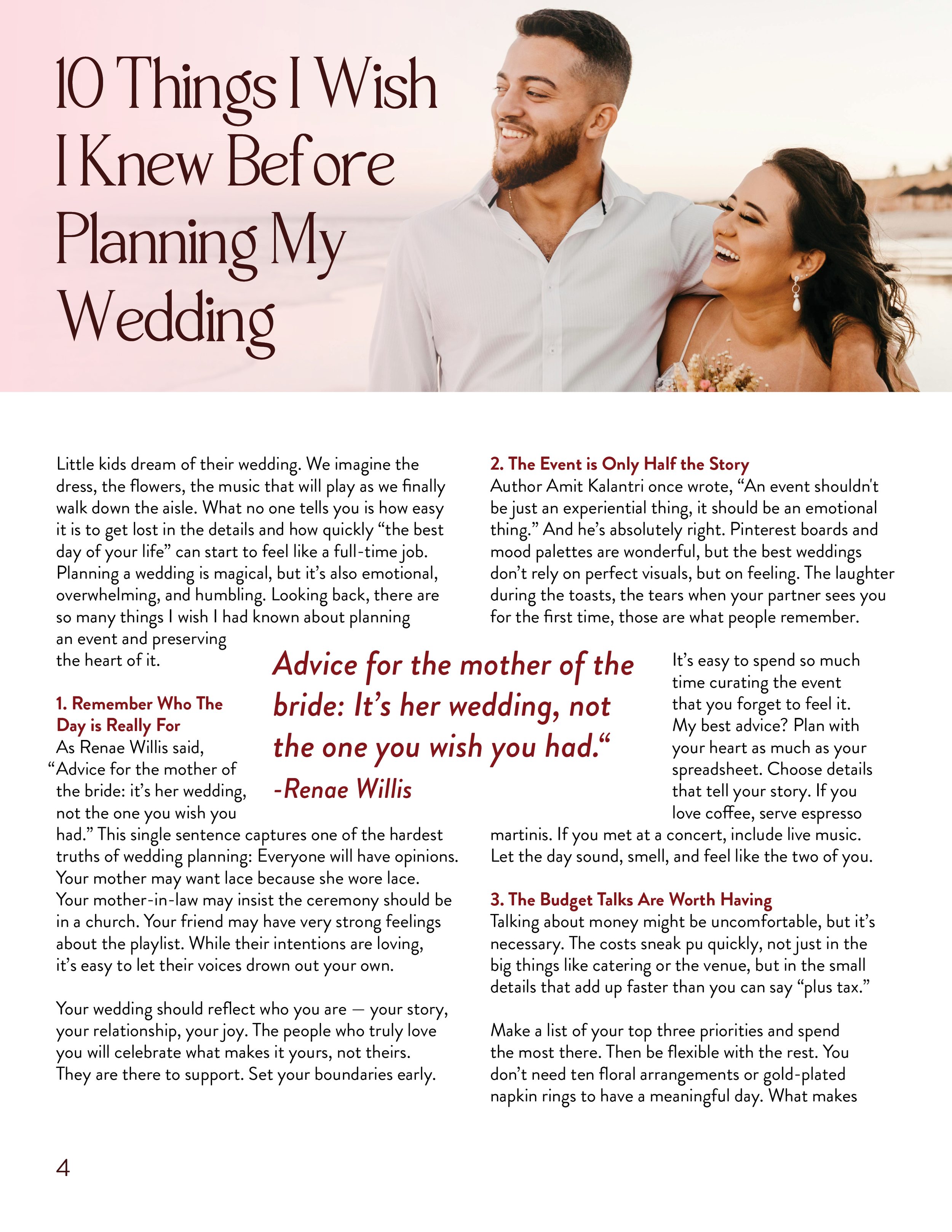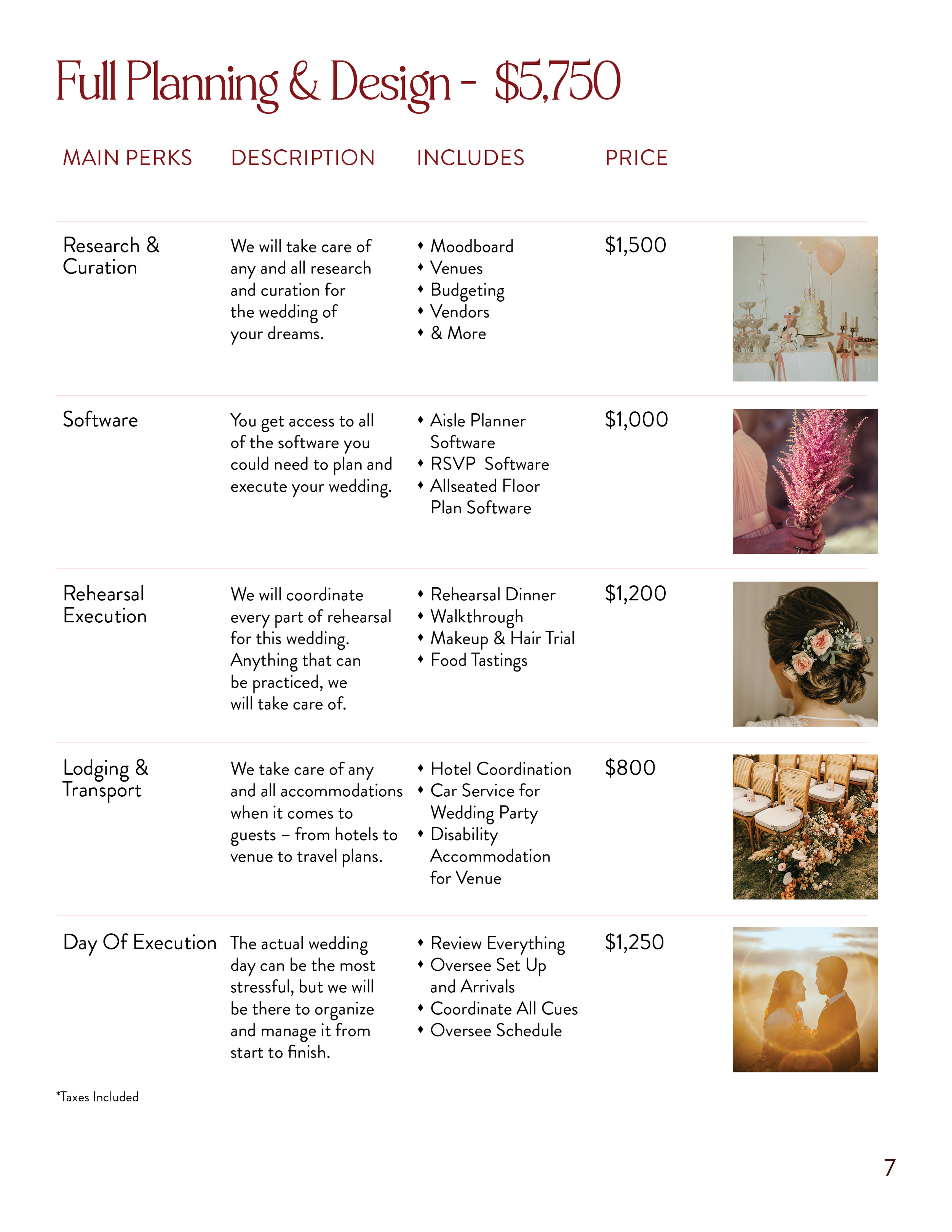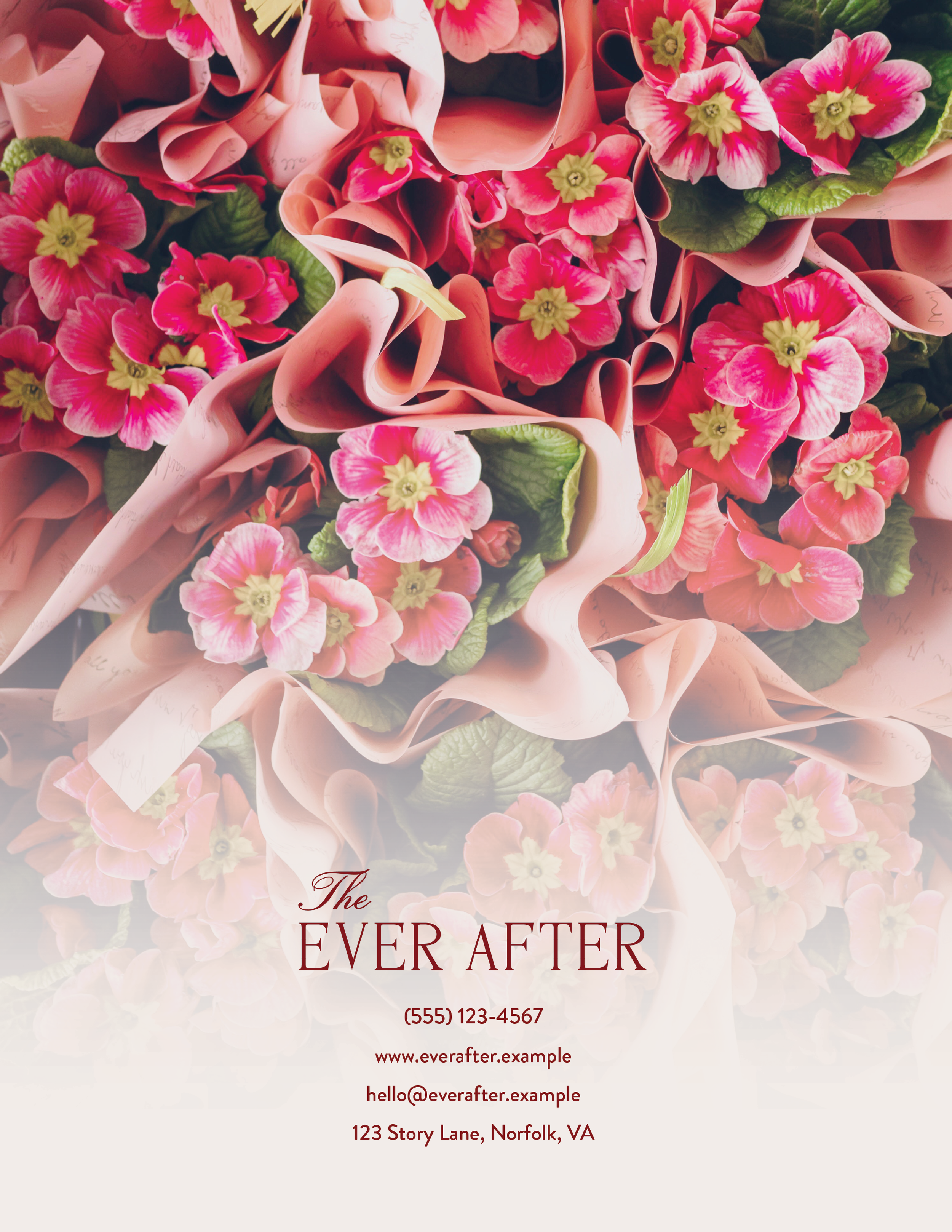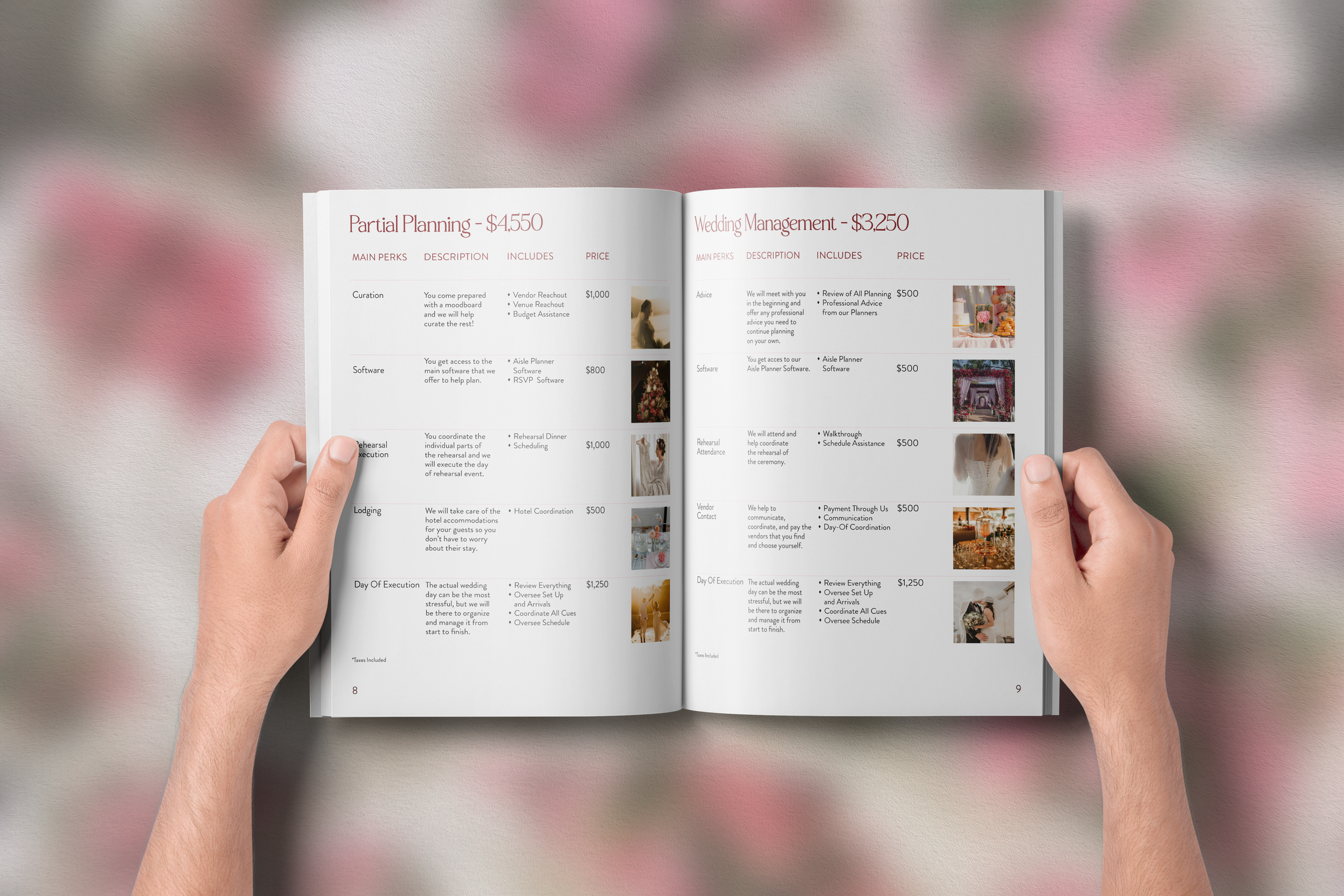 The Ever After originally began as Vows & Veils, a project I created to challenge myself while learning InDesign. I wanted to design a service catalog that made use of the table tool, combining my love for weddings and layout design with a new technical skill. The result was a 12-page catalog featuring an article and four coordinated tables. From wireframe to final, the concept stayed true to my vision, though I streamlined the design by unifying the tables into one consistent style for a cleaner, more cohesive layout.