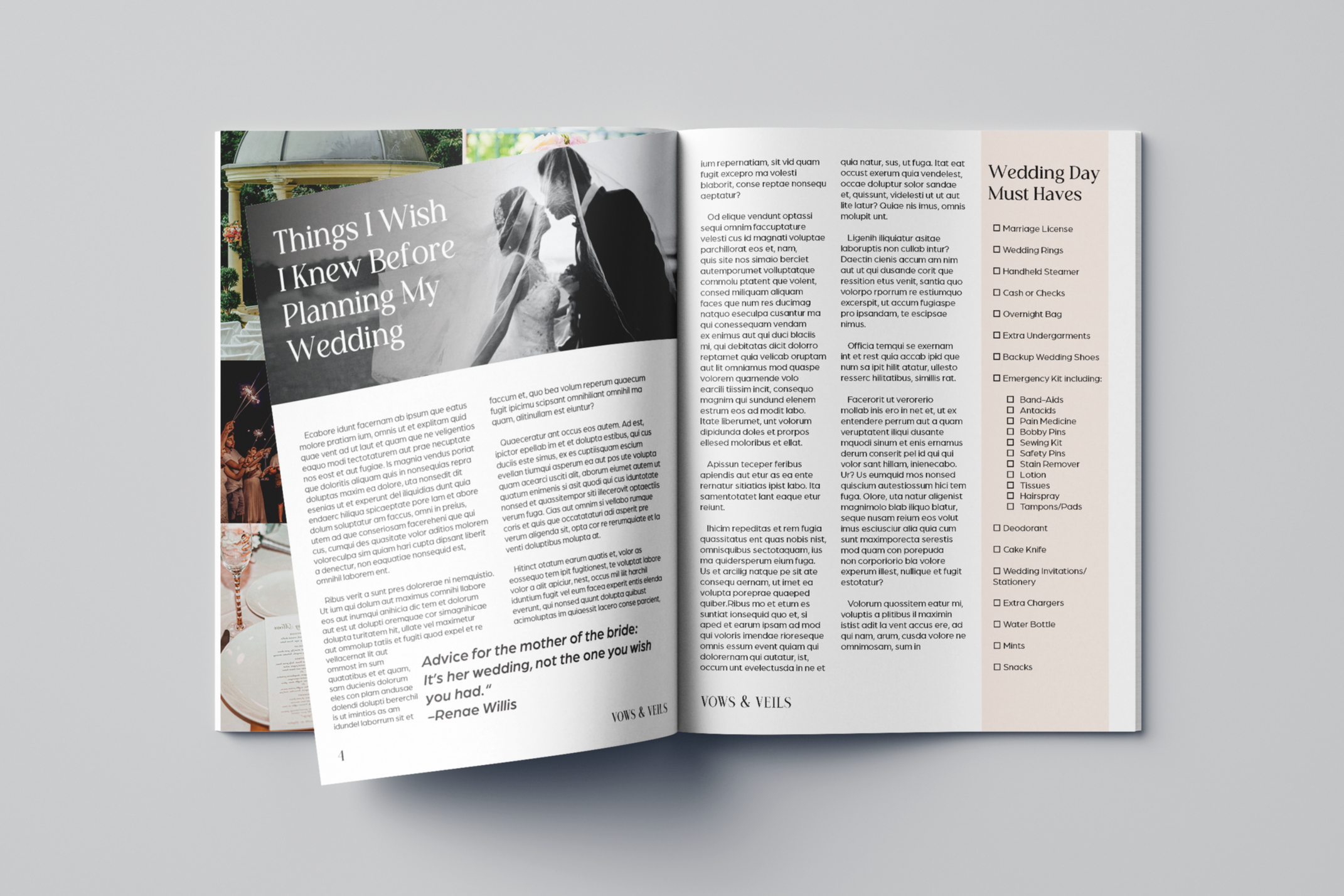 This was my first iteration of Vows & Veils. While the layout was strong, the branding had room to grow. I created this piece early in my design journey, and even then, it quickly became one of my favorites. Revisiting it this year with fresh eyes and more experience, I knew I wanted to reimagine the project, refining the design while keeping the heart of what made it special.