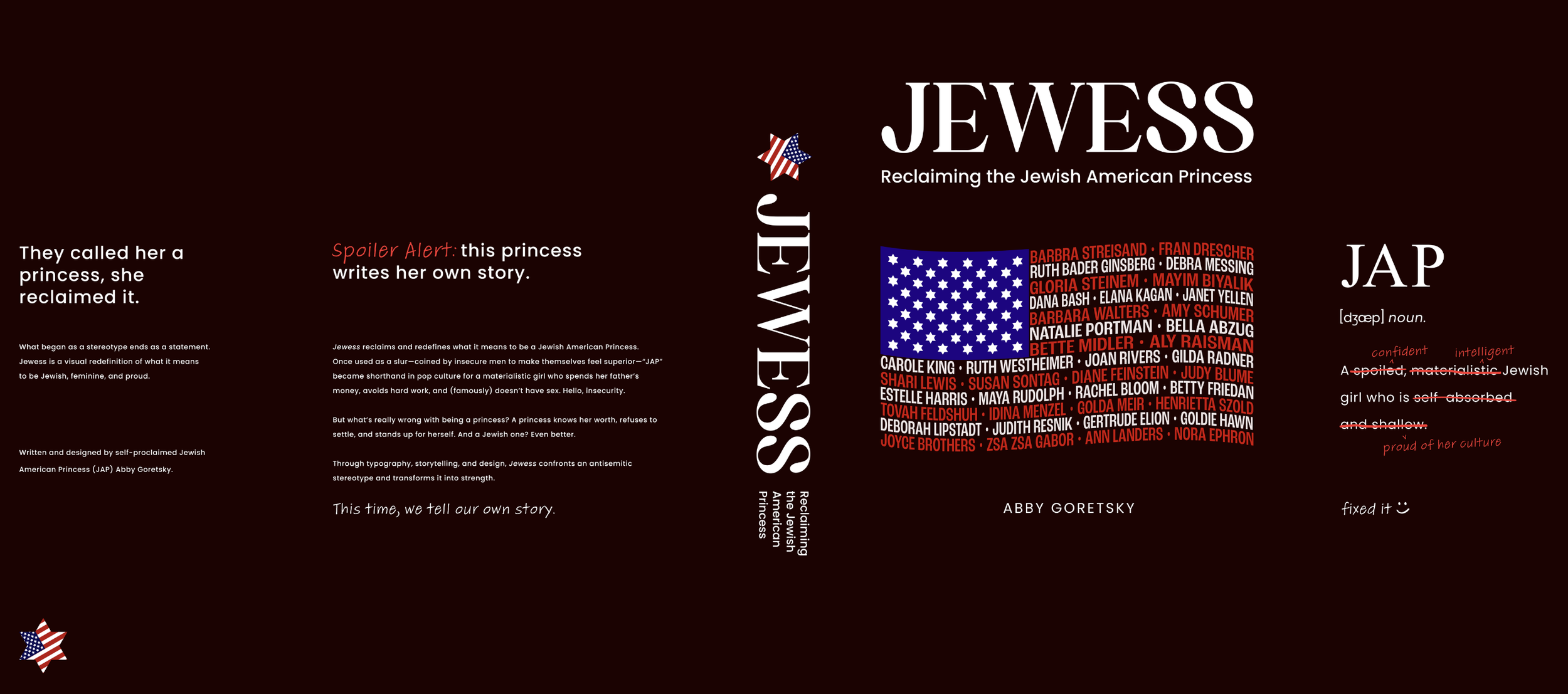 I believe I achieved that intent by transforming a stereotype into something empowering and deeply personal. Expanding the project into a full dust jacket gave me room to tell a stronger visual story through typography, color, and tone. In the end, Jewess became more than just a design exercise, but also a reflection of my voice, my culture, and the power of reclaiming identity through art.