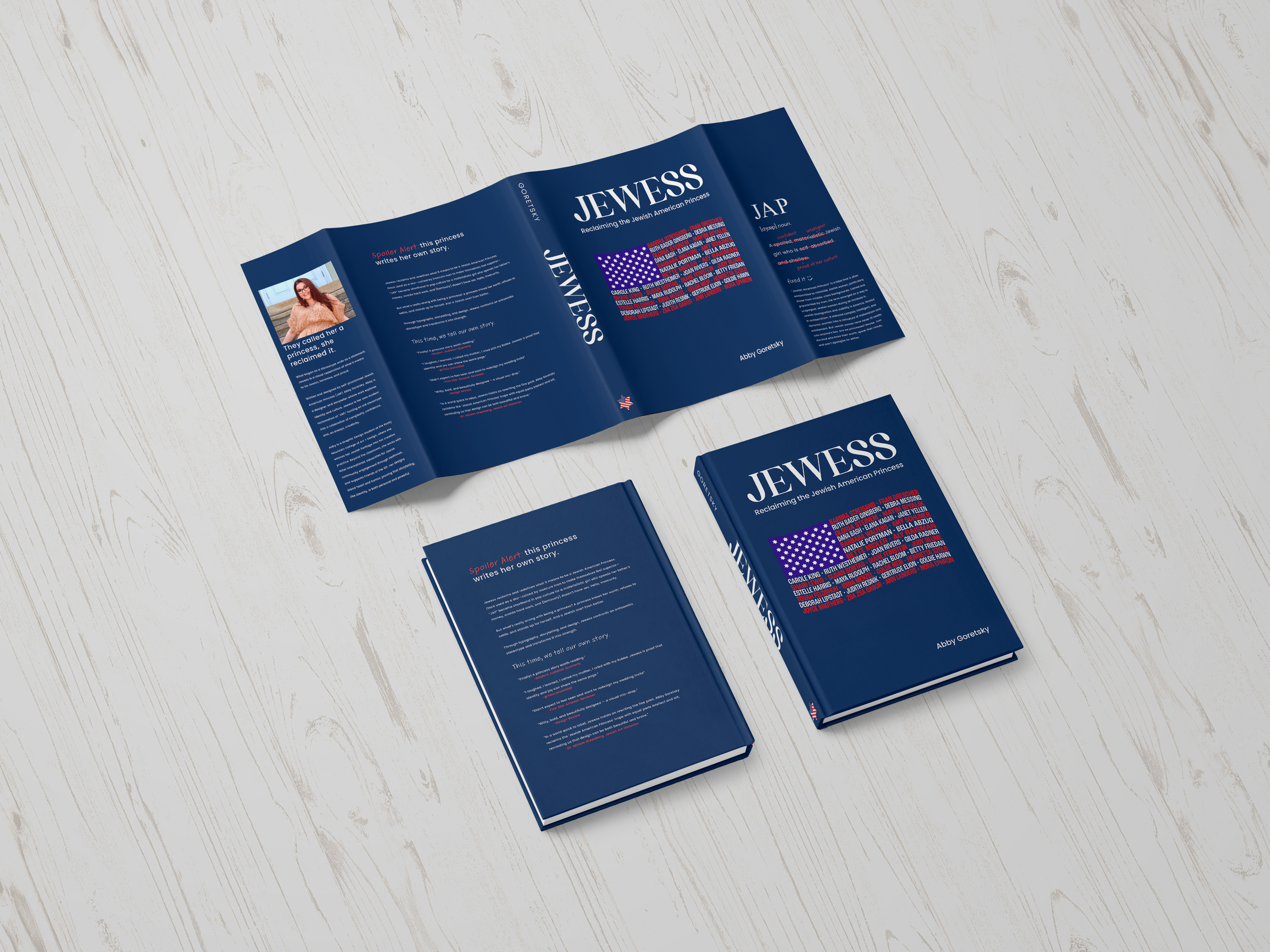 When I started building my portfolio, I knew I wanted to include Jewess, but I also knew I wanted it to be more. So, I decided to expand it! With my professor’s guidance, I transformed the original magazine cover into a full dust jacket, turning a single-page design into a more powerful, comprehensive visual story.