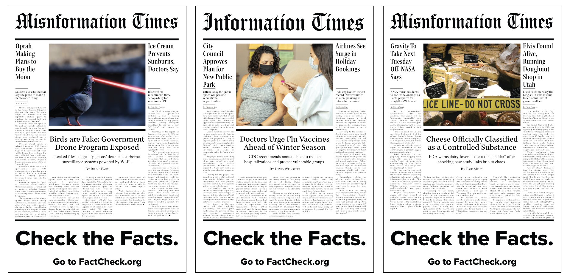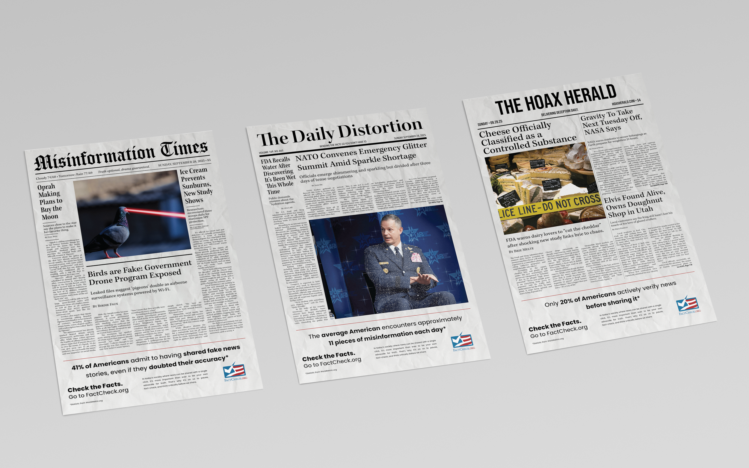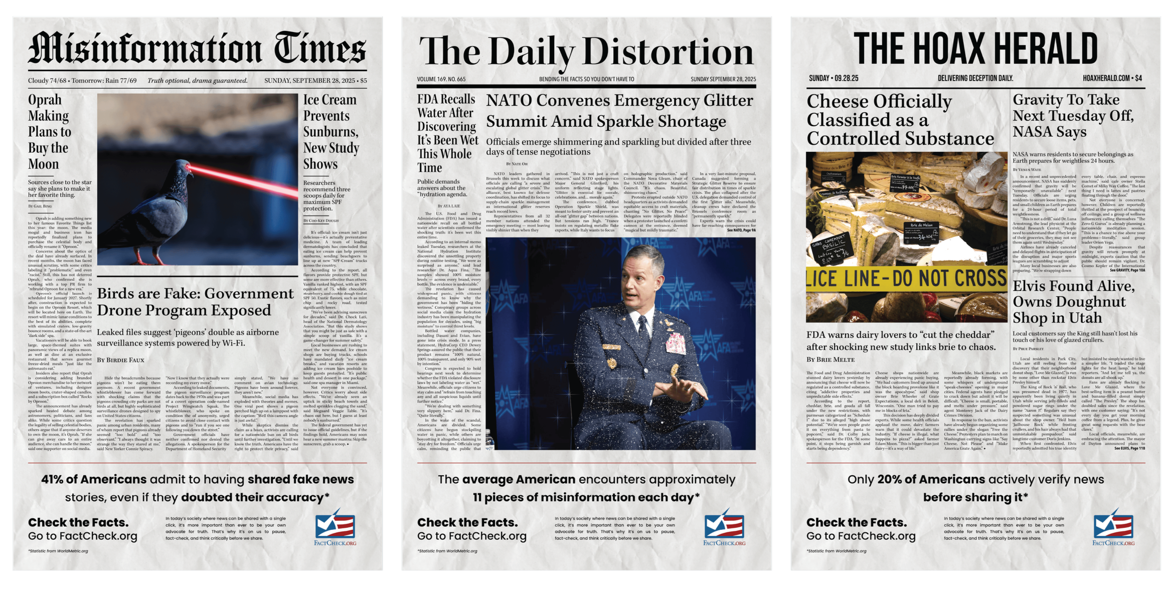My first digital version included two newspapers full of misinformation and one with real stories. The goal was to show how easily false information can look just as believable as the truth, and how design can make even the absurd seem credible. I added a call to action that directed readers to FactCheck.org, a great resource for verifying information on all kinds of topics.