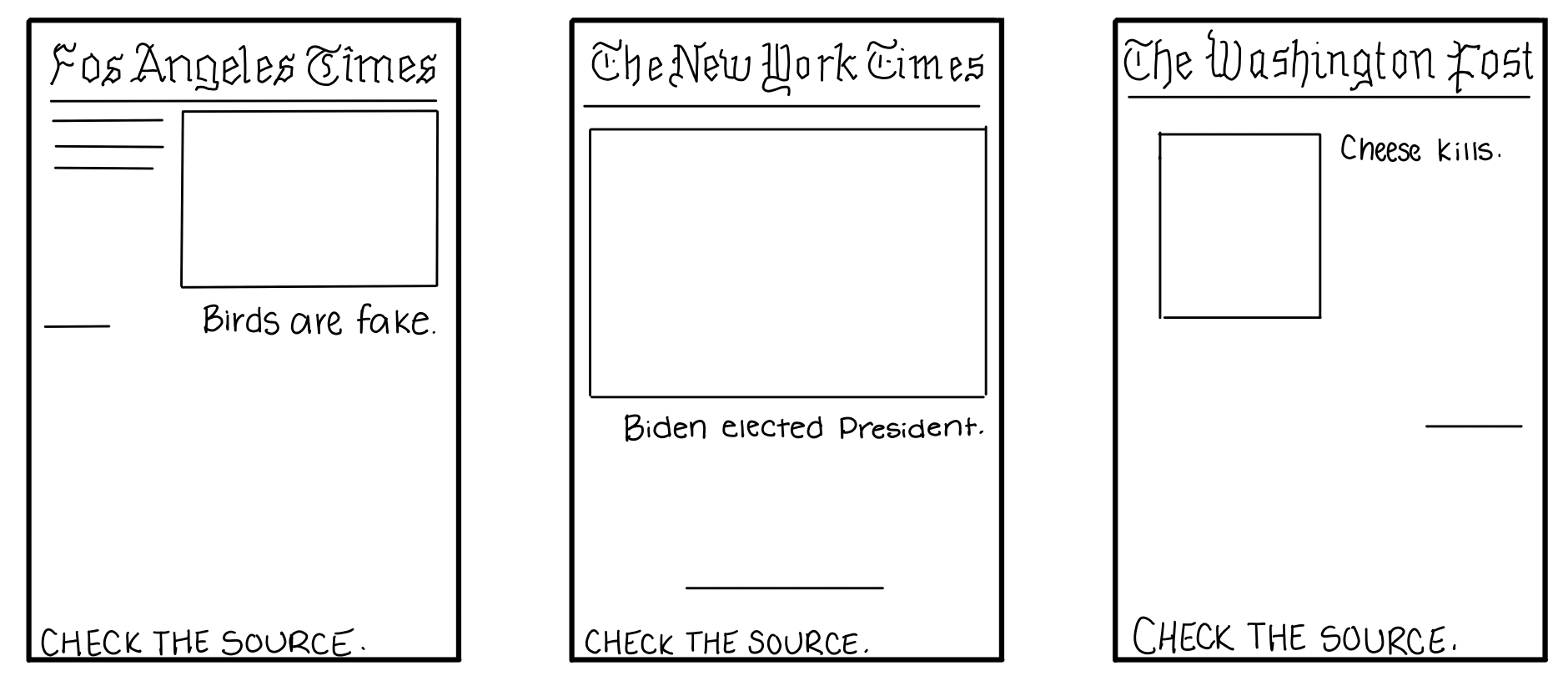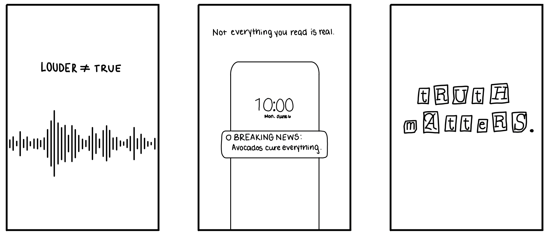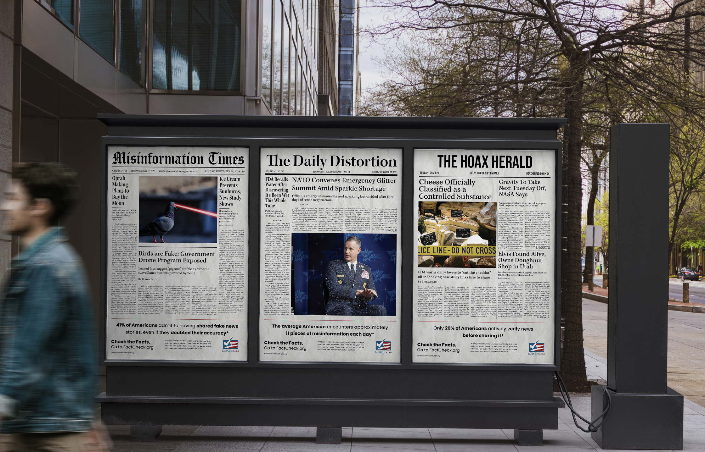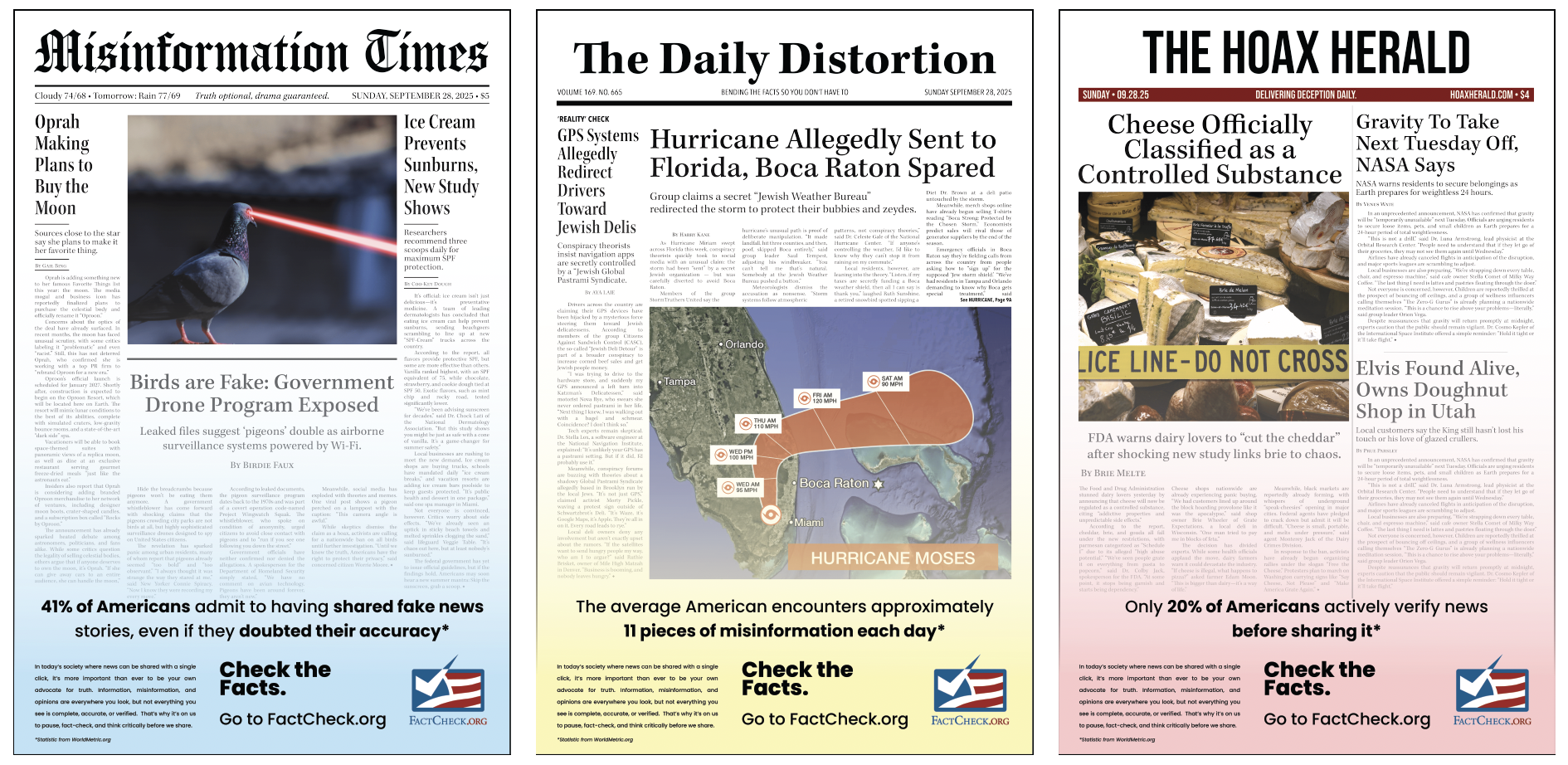 My first digital version included two newspapers full of misinformation and one with real stories. The goal was to show how easily false information can look just as believable as the truth, and how design can make even the absurd seem credible. I added a call to action that directed readers to FactCheck.org, a great resource for verifying information on all kinds of topics.